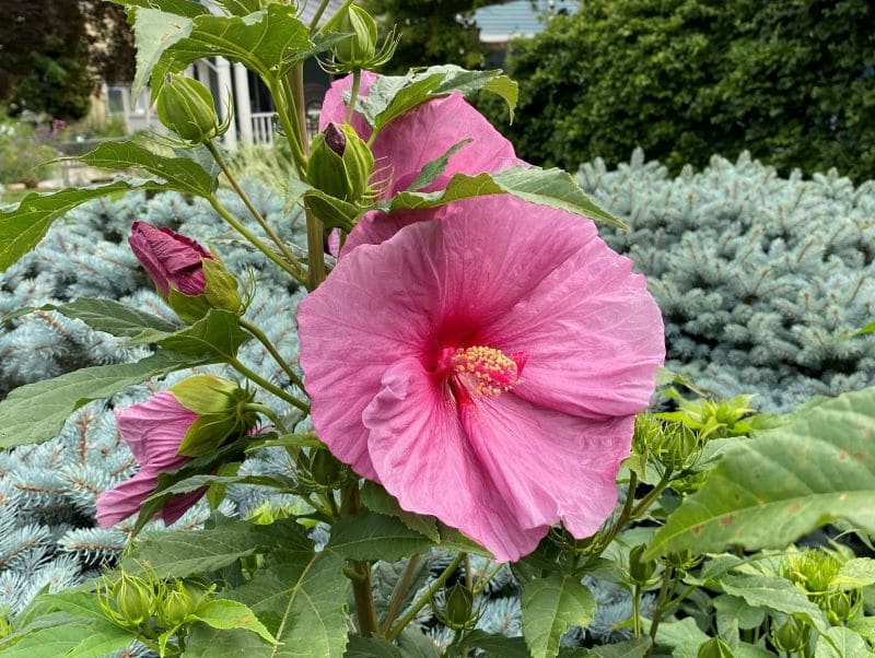 If you have the blue macrophylla Hydrangea add some peat or aged oak bark around the base, the acidity in the peat or oak bark encourages a deeper blue hue. Hydrangeas are a wetland plant and require plenty of water throughout the summer. We had a late spring and with all the spring and early summer rain and good sunshine, the foliage and bloom of the hydrangeas are performing well.