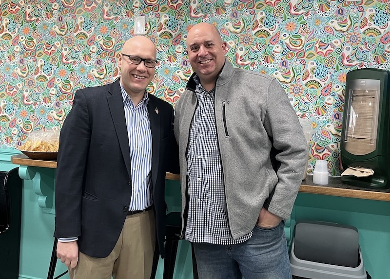 State Representative Devin Carney (R-23rd) reads a General Assembly Official Citation welcoming Papi’s to Old Lyme while Old Lyme Selectman Matt Ward (right) listens attentively.