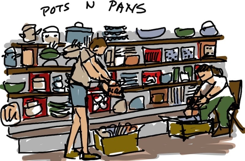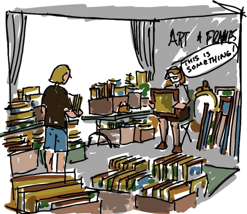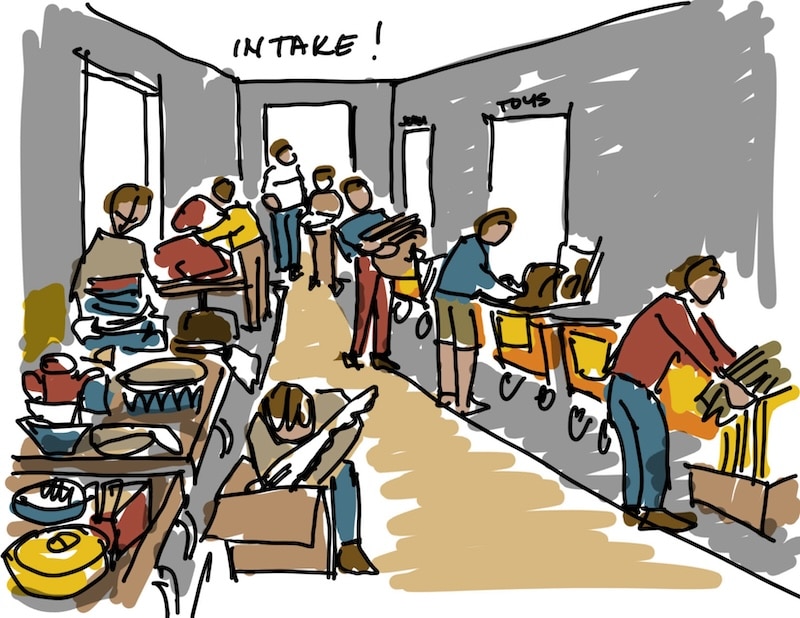 Each item is sorted into rows of shopping carts along one side of the hall and tables across from them. Big yellow signs indicate categories like: pots ‘n’ pans, appliances, books, music, men’s, kid’s, women’s clothes, toys, shoes, art, fine goods, kitchen, knick-knacks, linens, etc. …