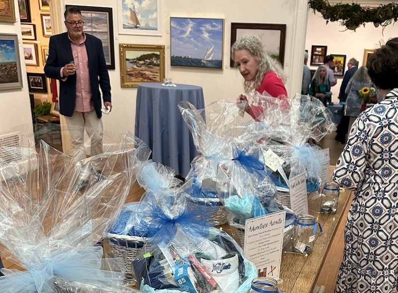 LAA artist and committee member Liane Philpotts (center) peruses the tempting basket raffle at the ‘Sea and Sky Soirée.’ Photo by S. Thompson.