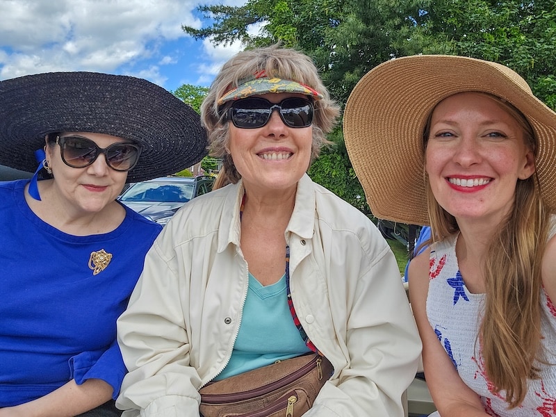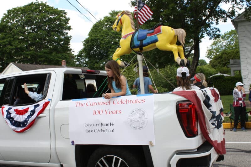The modern day reincarnation of Phoebe Griffin Noyes, otherwise known as Mary Dangremond, travels in style as part of the Old Lyme-PGN Library contingent.