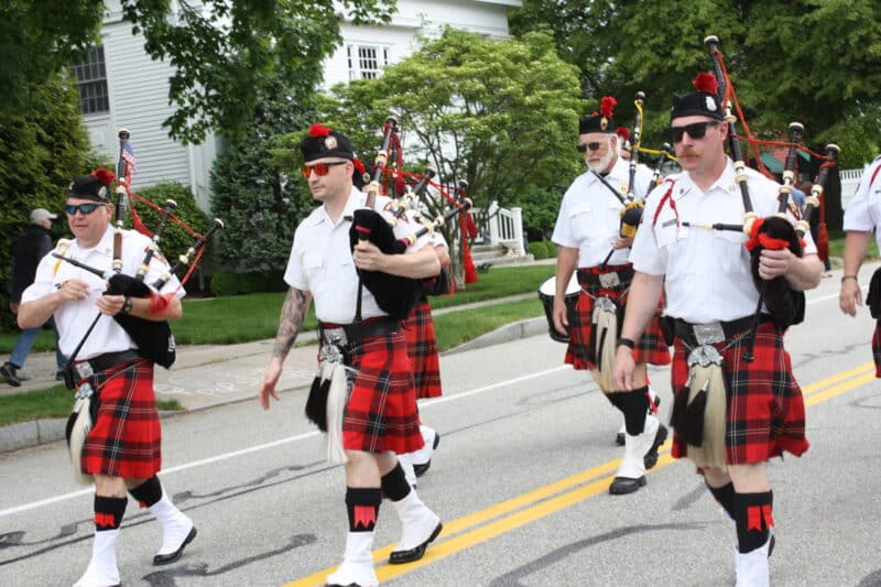 The New London Firefighters Pipes & Drums Corps show some leg on Lyme Street.
