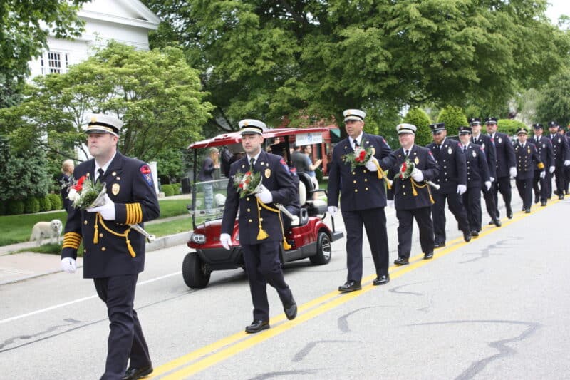 Fire Department officers march with bouquets from Old Lyme Landscape in their ceremonial trumpets.