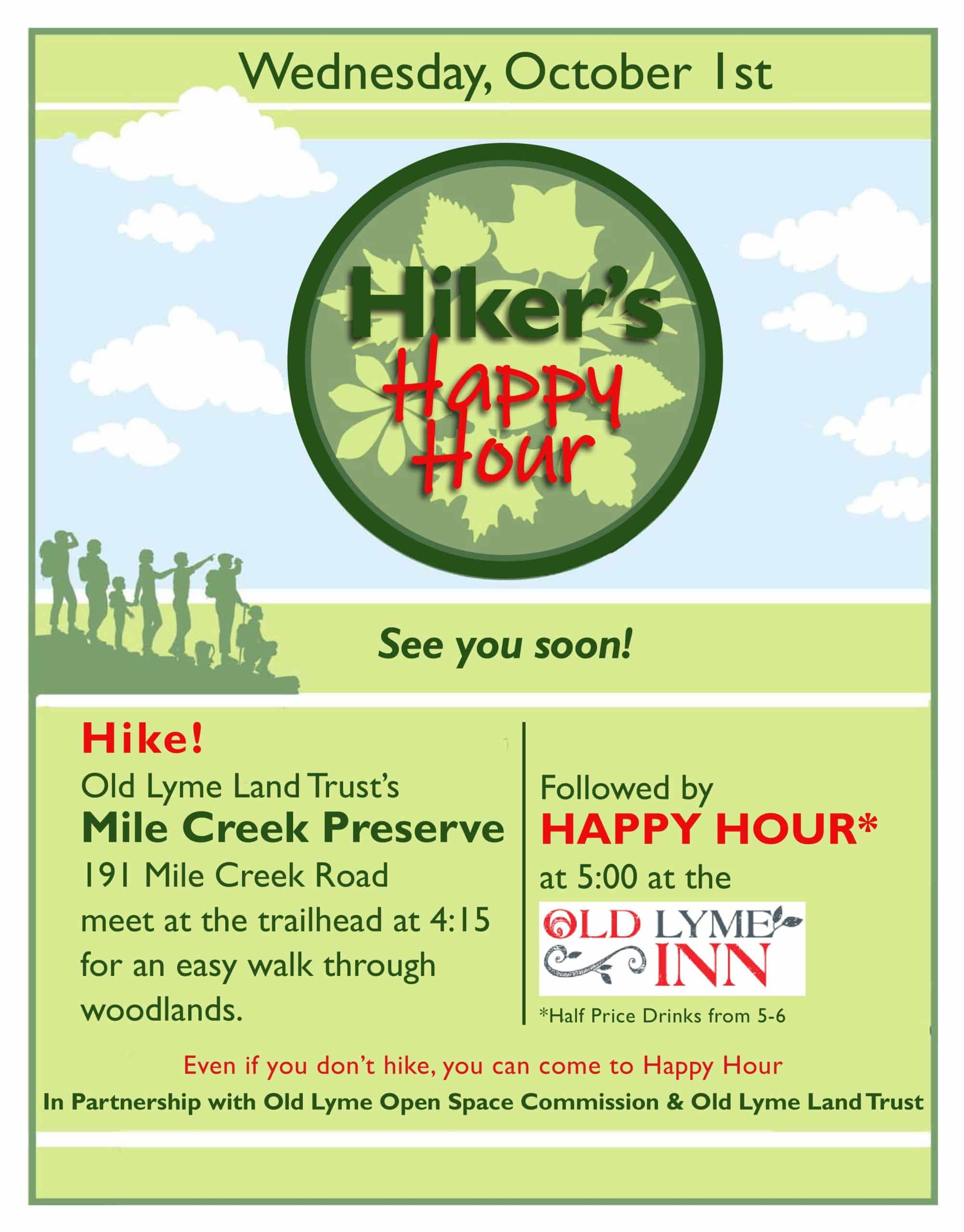 OLD LYME—The Old Lyme Land Trust, the Old Lyme Open Space Commission and the Old Lyme Inn are sponsoring another “Hiker’s Happy Hour” on Wednesday, Oct. 1.