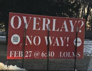 The “Overlay? No Way!” crowd was evident over the winter in signs across town and at a Zoning Commission public hearing that filled the high school auditorium to maximum capacity. A vast majority of the 550 attendees came out in opposition.