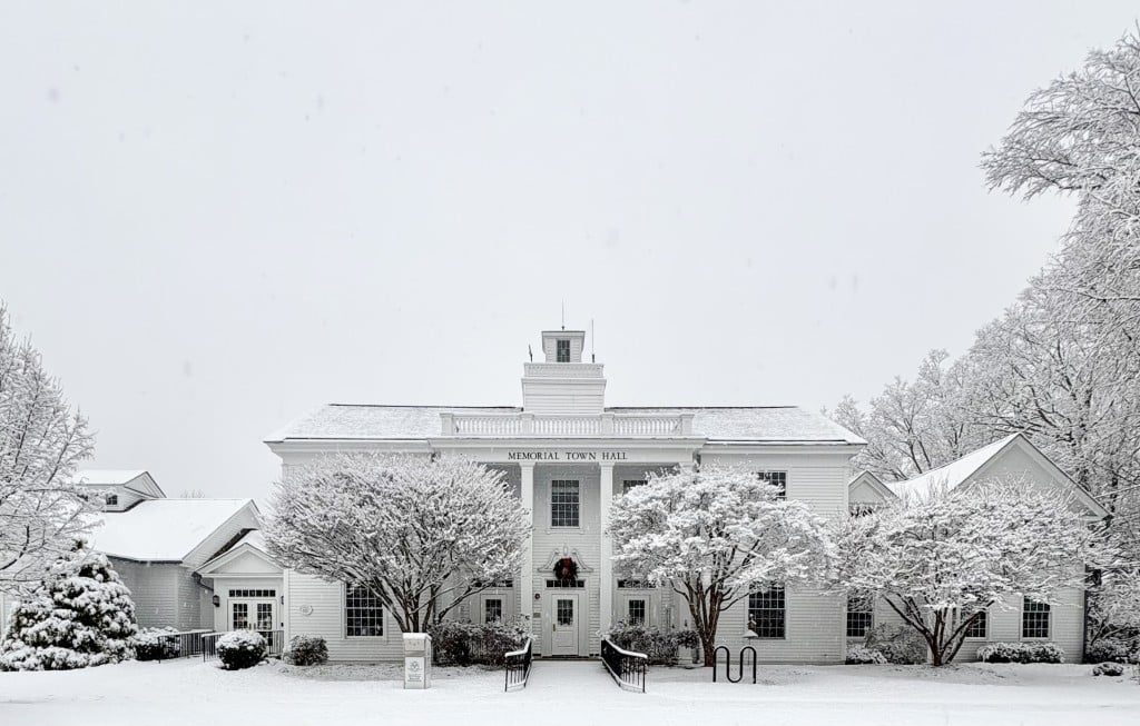 Old Lyme Memorial Town Hall in winter. Credit: James Meehan/LymeLine.