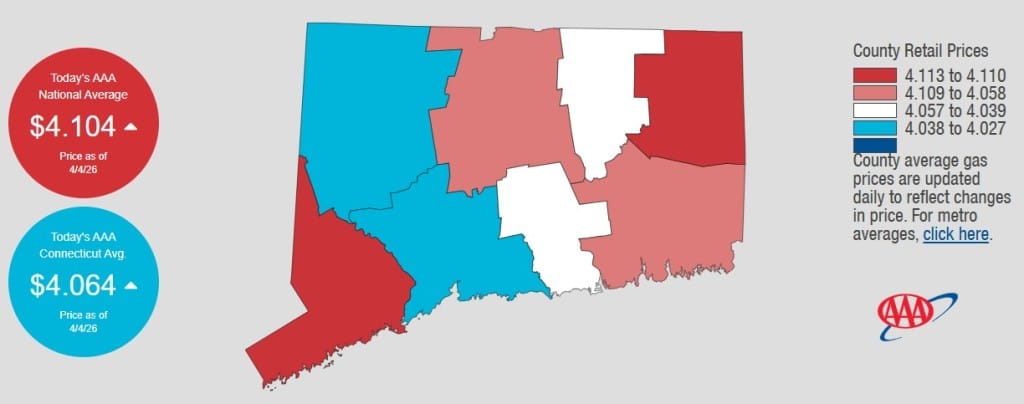 AAA reports New London County averages $4.08 per gallon for regular unleaded gas, up from $3.95 a week ago. Analysts warn relief may not come soon.